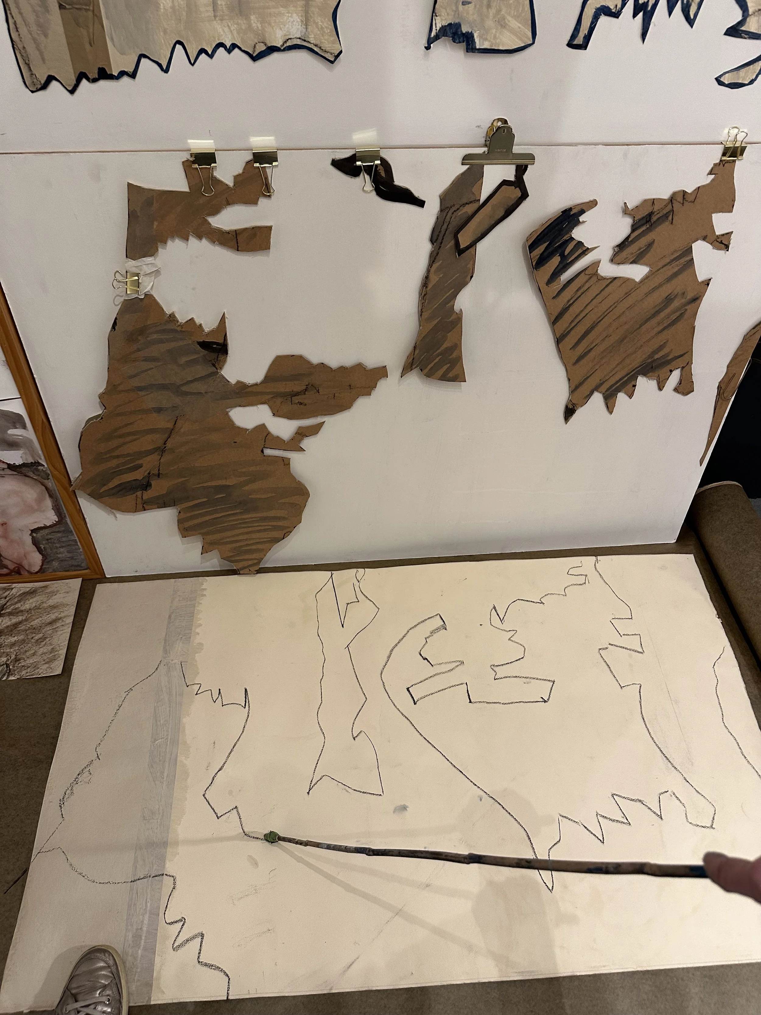 Charcoal on a long bamboo stick is often my go-to starting point. It loosens me up and forces me to focus purely on the act of making a mark, since it’s so hard to control. Sometimes I’ll begin on top of an old study rather than a blank page, as the existing layers and colours give me something to respond to. It’s freeing and I now realise as writing this - I should do it more!